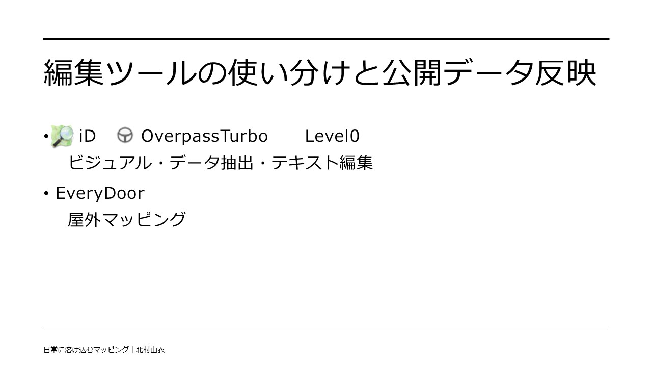 - 後から見返して情報を補うのに使う。EveryDoorでも、publish to OSM のオプションを有効にすることで有効活用可能
